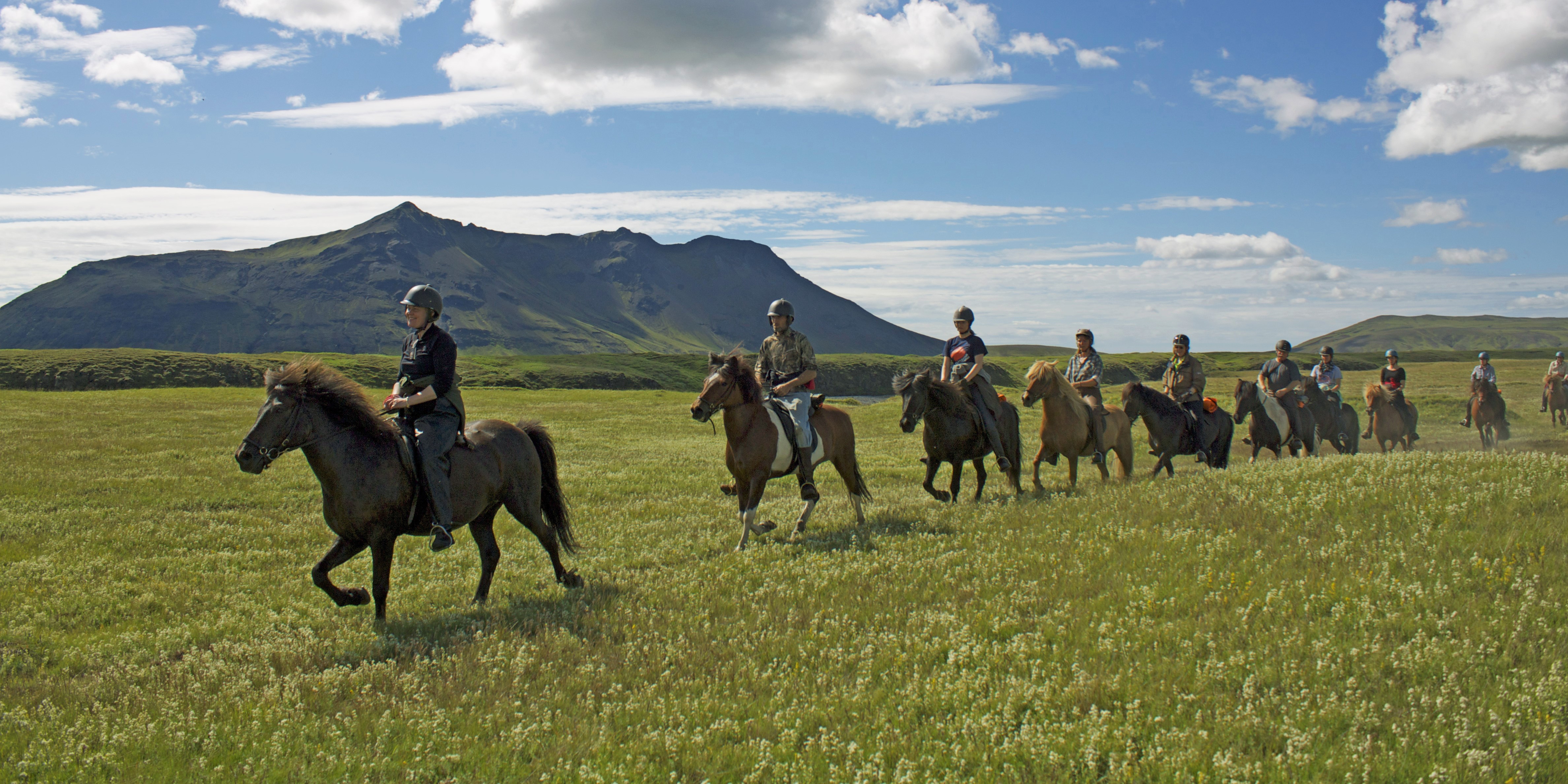 This tour takes us to the colourful landscape between the famous volcano Hekla and Tindafjallajökull glacier. This area is known for amazing nature shaped by the forces of volcanoes and glaciers. We ride with a herd of free-running horses on nice, soft riding paths on the black sandy ground covered by green grass and through lava fields in a mystic scenery of volcanic formations created by many eruptions of the volcano Hekla through the centuries. Some of the eruptions destroyed the habitation in certain areas. We can feel the presence of the natural force and the mystique surrounding Hekla, together with elements from the old Sagas. Our riding path follows an old Viking trail that the Viking Gunnar from Hlíðarendi in Njál´s Saga was riding when he ended up in one of his many battles. On our way, we enjoy hidden valleys, wide green pastures and mighty rivers. The combination of beautiful nature, great horses and fantastic riding paths makes this tour a memory for life!