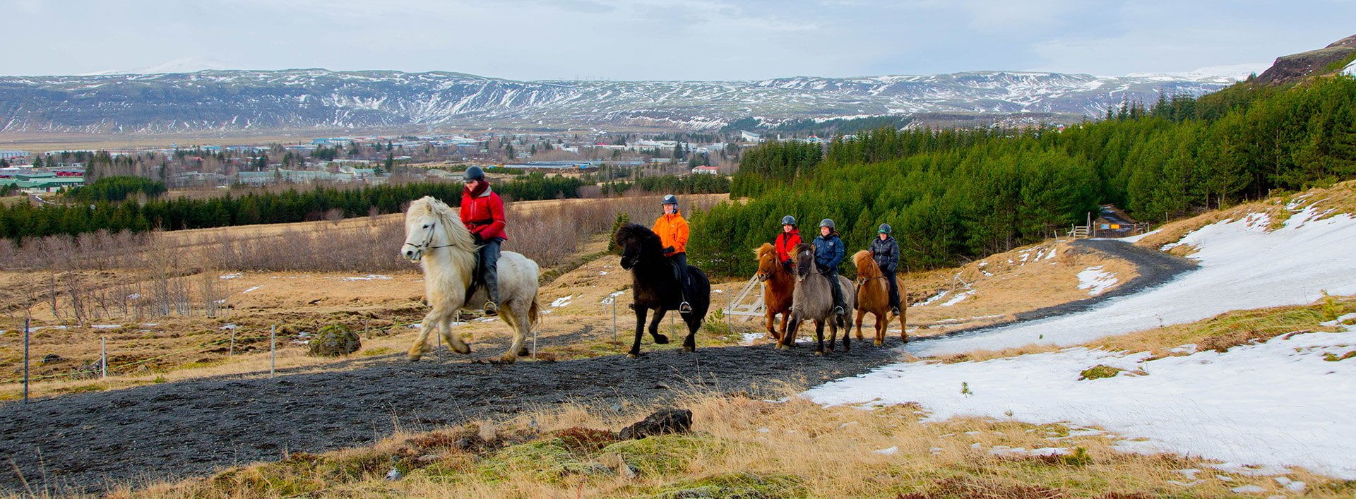 Spend a relaxed day in the countryside! We start the day with a tour in the surroundings of our farm. We ride for 2.5-3 hours through lava fields and meadows. After the tour a light lunch is waiting for you at our comfortable Hotel Eldhestar. After lunch, we take you to Hveragerði’s excellent swimming pool to soften up in the warm, soothing geothermal water of the hot pot or relax in the steam sauna. The program ends with coffee and home-baked cake at our farm.
